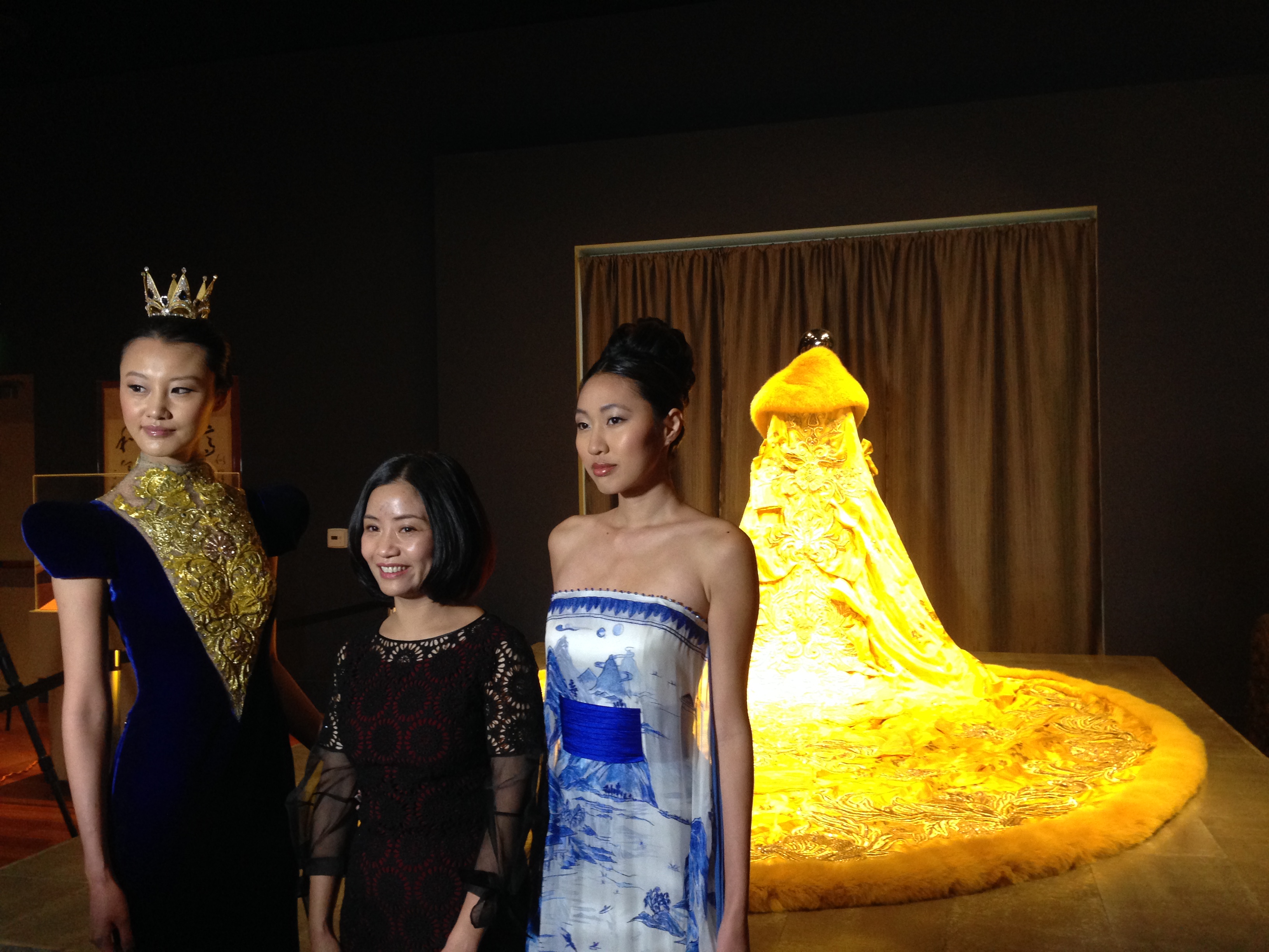 Guo Pei herself was on hand to introduce the gown to Southern California. Sweet and charming she expressed her happiness at having it on display at Bower’s Museum. She also told us how she had no idea who Rihanna was when she was approached to provide a dress for the Met Gala! In the photo above she’s flanked by two models wearing additional designs of hers. The blue velvet dress has a long train and the the blue and white gown is made of the most delicate material. Both dresses were stunning in person and I only wish I had the figure to wear them myself.