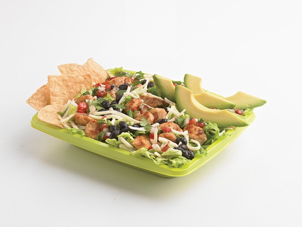 The Mexican Chopped Chicken Salad is made with fresh grilled chicken, black beans, avocado, tortilla chips, fresh avocado, cilantro, spicy jack cheese, a lettuce blend and handmade pico de gallo. It come with salsa casera to use as a dressing.