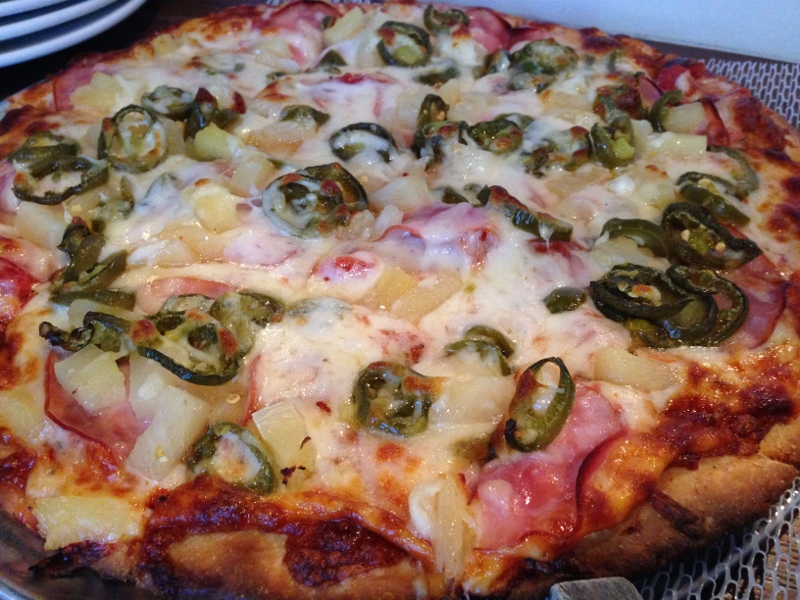 pizza! I loved, loved the top pie. Ham, pineapple and jalapenos. Ordinarily, being a wimp, I wouldn’t have thought of adding jalapenos to Hawaiian style pizza. But, man, it was a tasty addition! My friend was also super impressed the pizza was cut in squares…just like in Chicago!