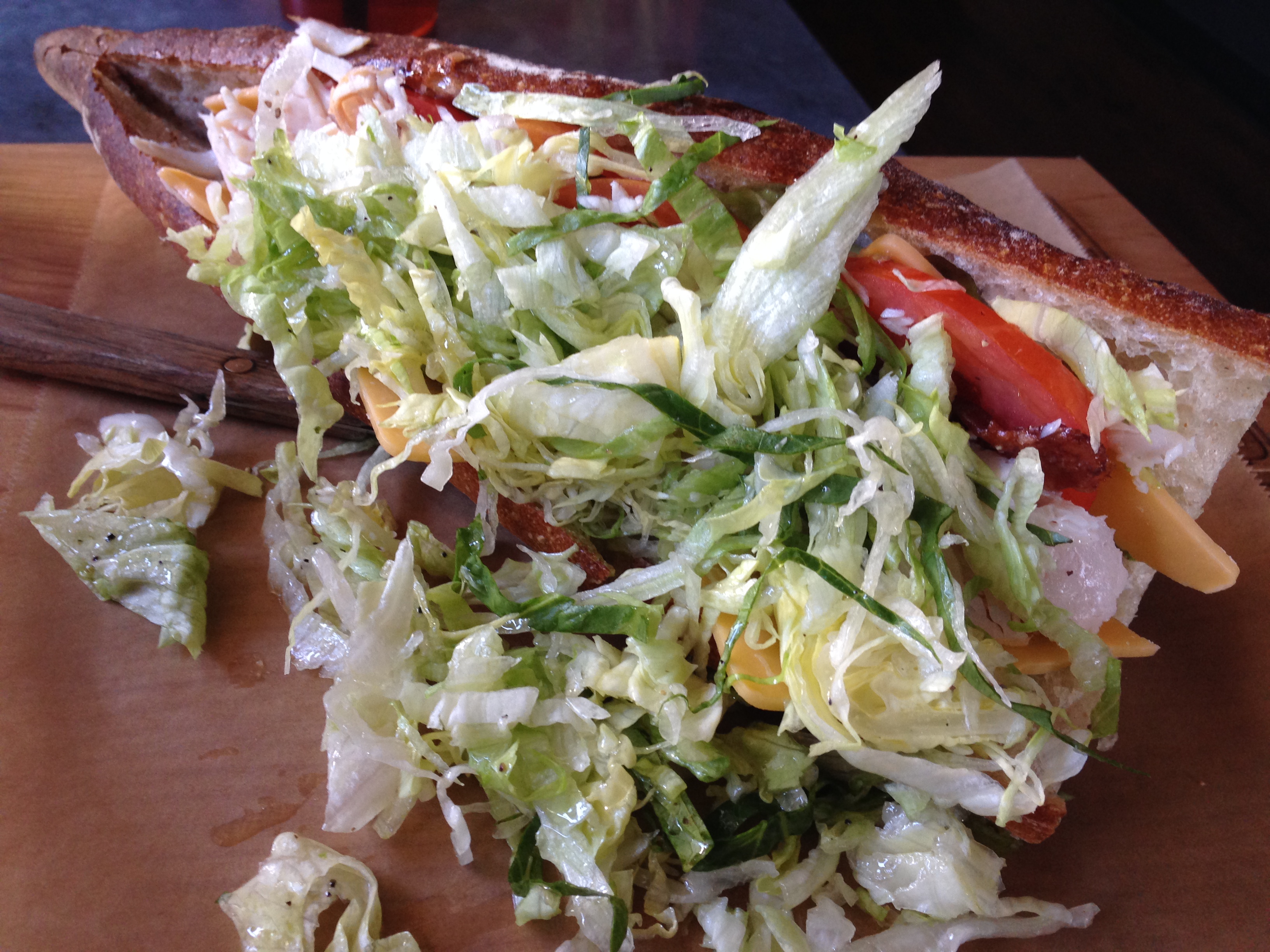 That is the Roasted Turkey Club – it’s on half a baguette with shredded lettuce, tomato, cheese, bacon and a basil oil. Oh Man! It was so tasty. And HUGE. My companion opted for the Garden Fresh Flatbread.