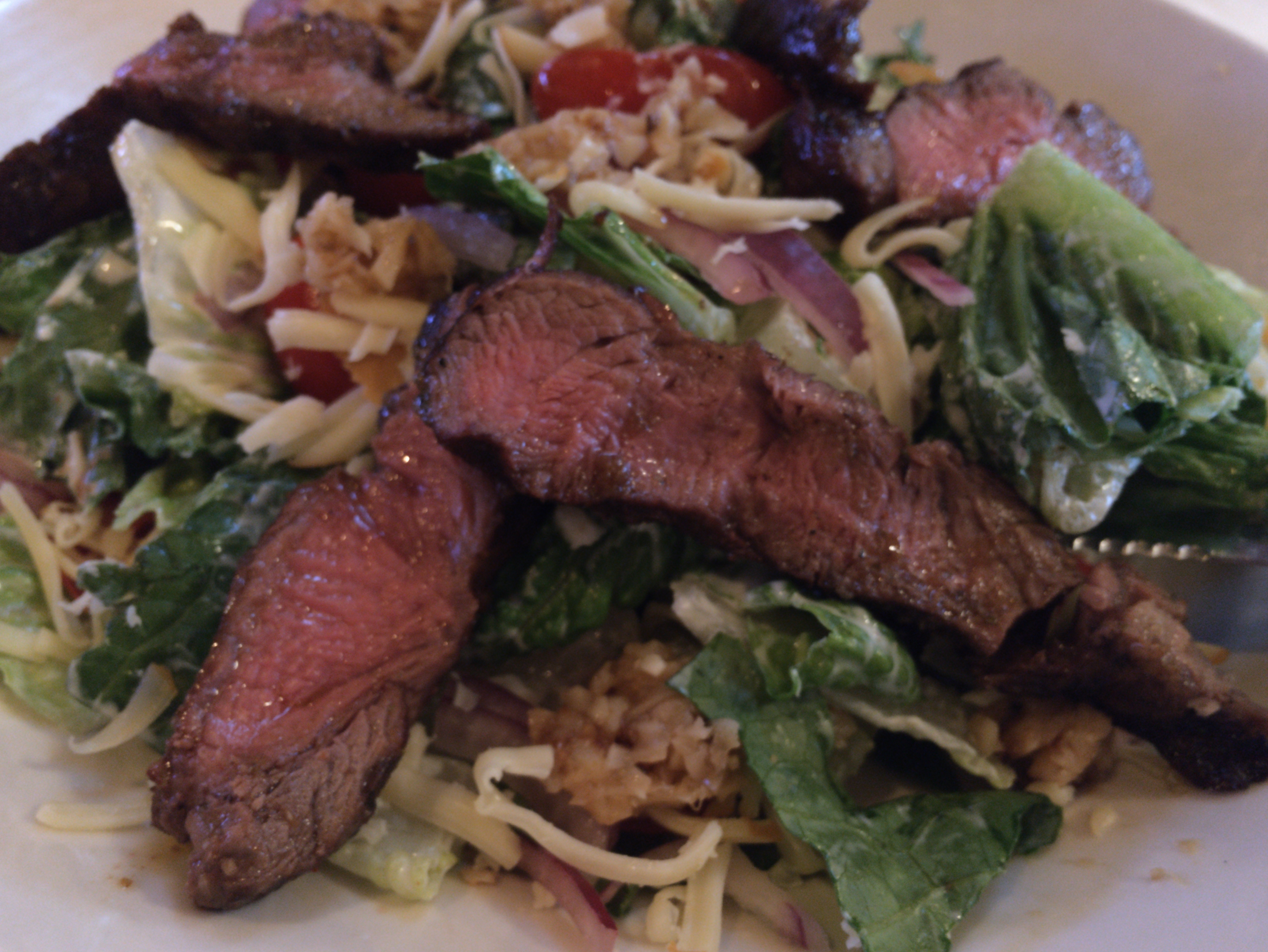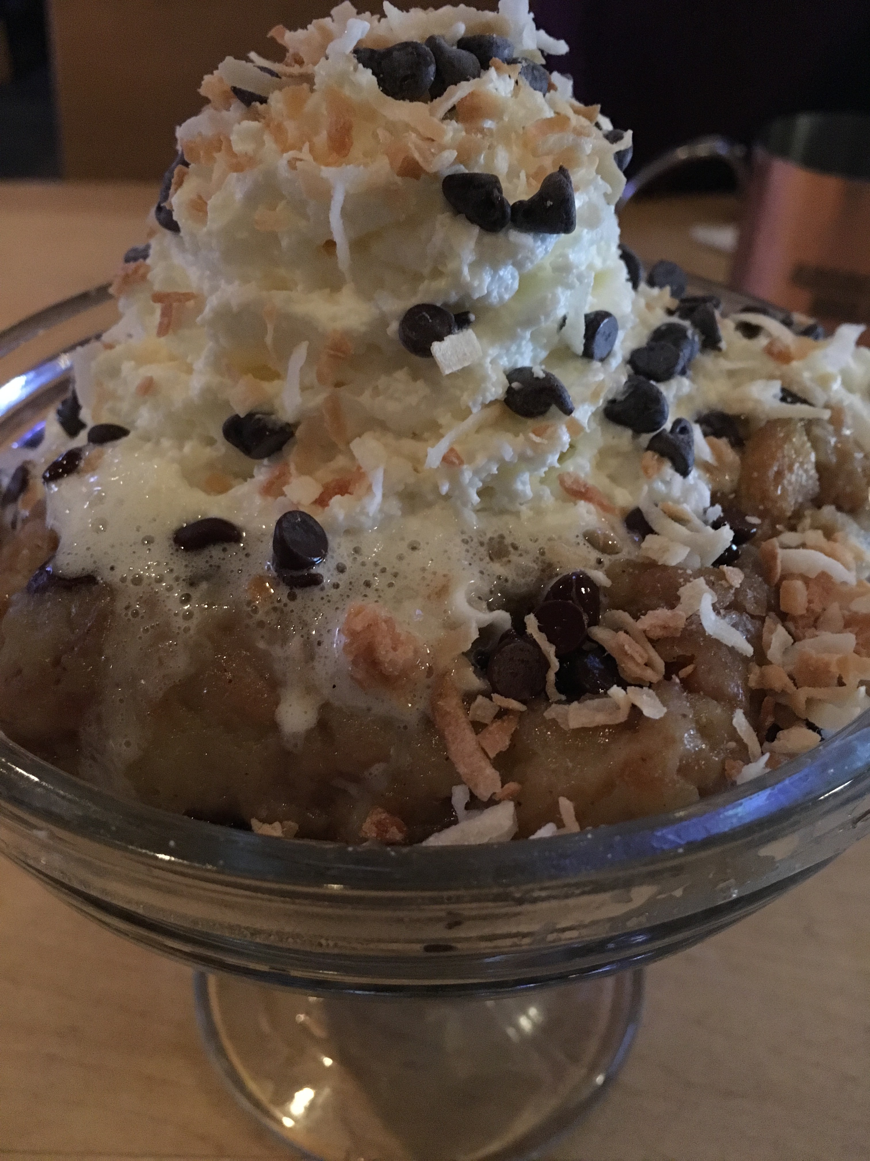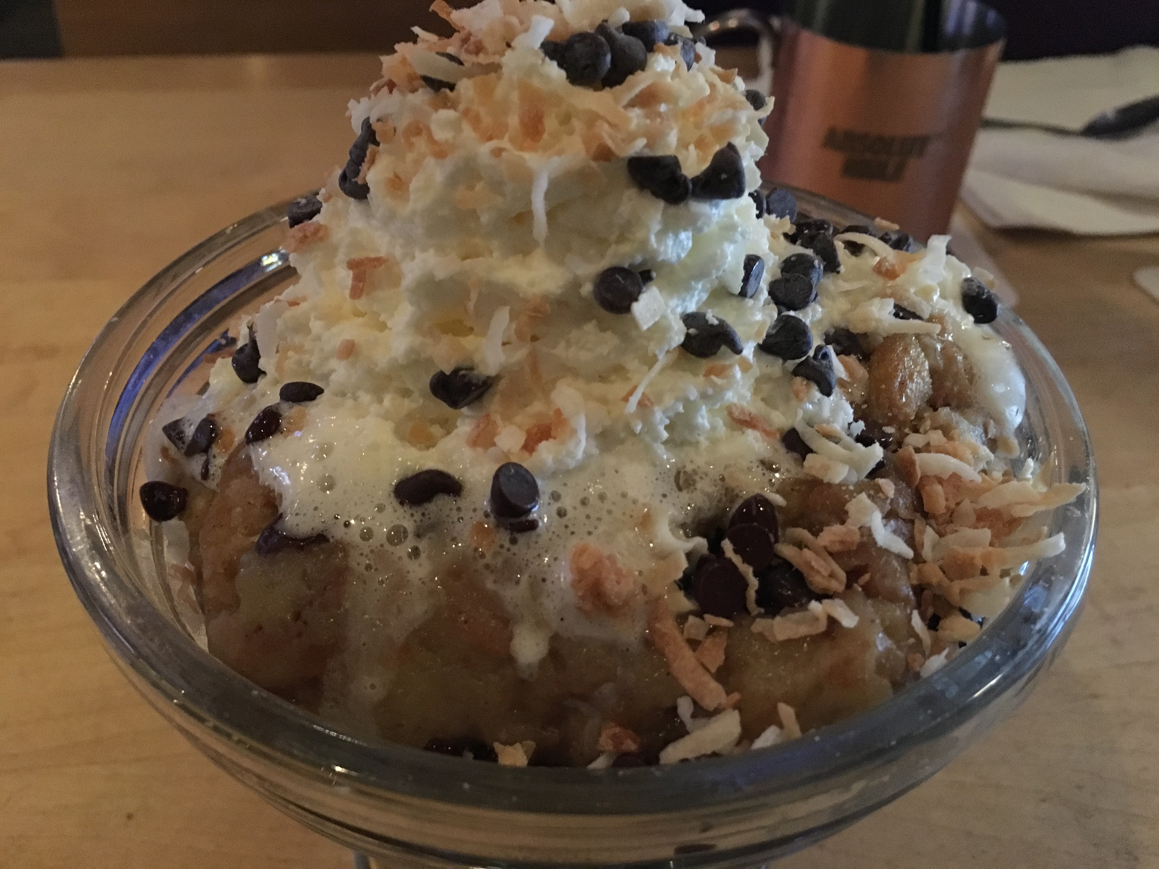 My companion and I shared the Cran-Brie pizza and the Garlic Steak Salad both tasty in their own right. Soon en0ugh it was time for the bread pudding. At Stacked you can customize it with all sorts of toppings from sauces to nuts to ice cream. I decided to top mine with chocolate chips, toasted coconut and whipped cream.