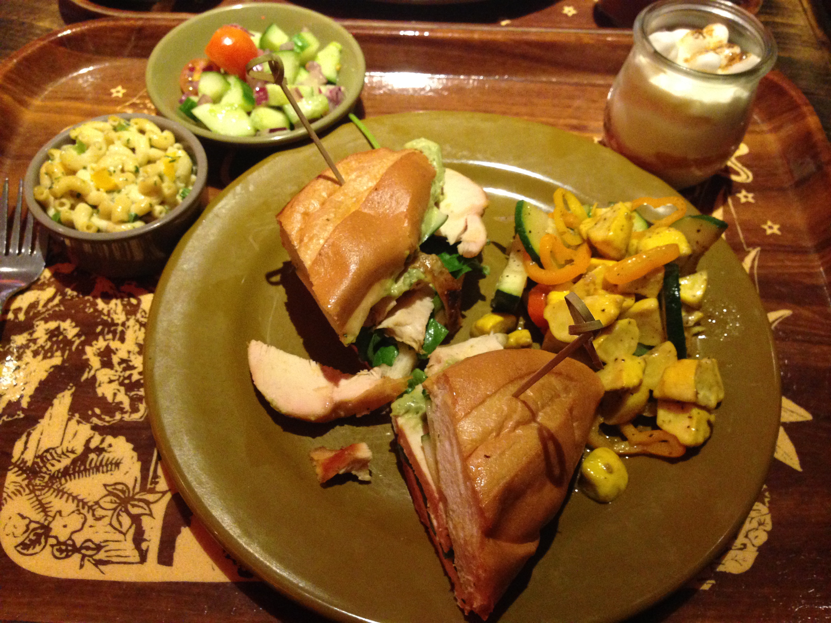 It was fun to see a blend of old and new dishes available. I decided to try the best of both and had macaroni salad, cucumber salad, a roasted chicken sandwich with a side of fresh veggies and ambrosia. Most of the dishes were delicious. The macaroni salad was unbelievably good as were the veggies and the sandwich. The cucumber salad seemed to be missing dressing and the ambrosia had an unexpected blast of rosemary but overall I thoroughly enjoyed my meal. Shannon went for the turkey dinner and I had to sneak a taste. Mm MM. I think I’ll go for that next time.