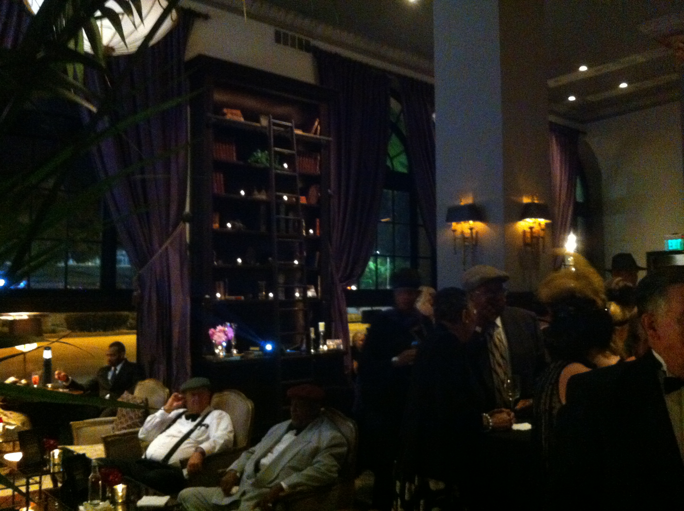 Outside the hotel, we walked the red carpet, past a few lovely classic automobiles, and were greeted by “Munchkins”. We took advantage of the photo ops and were given clues to the password (these are the days of the speakeasy, remember?). Once inside the doors, we were promptly greeted with a tray of cocktails and the strains of jazz. There were even cigarette girls offering candy cigarettes! We settled into a comfy settee near the inviting bookcases as silent screen stars played out their love scenes on a wall above the mingling ladies and gentlemen.