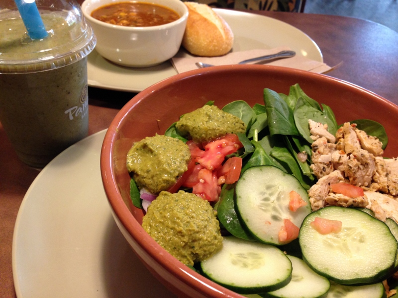 So one day I took my lunch break and headed over to the nearest Panera Bread. Three items struck me as the most intriguing – the Power Chicken Hummus Bowl, the All Natural Turkey Chili, and the Low Fat B-Green Power Smoothie. Naturally, I ordered all three.