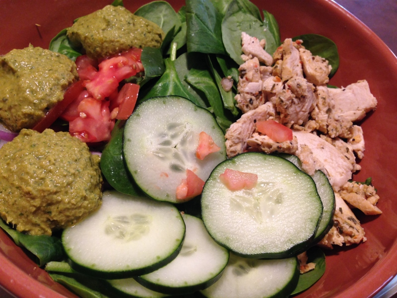 Oh, the Power Chicken Hummus Bowl. I think…no…I know this is my new favorite menu item. A bed of spinach topped with fresh cucumbers, tomatoes, red onions, chicken and hummus – it is fantastically delicious. And just think about the nutrients!